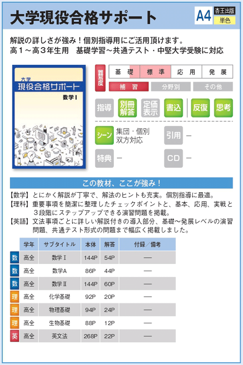 | 教材名 | 対応教科 | 難易度 | 利用シーン | 出版社 |