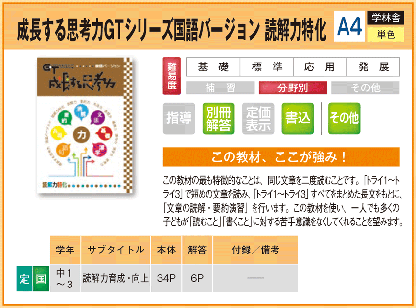 成長する思考力GTシリーズ国語バージョン 読解力特化 【教材詳細】 |